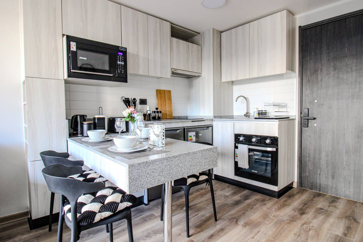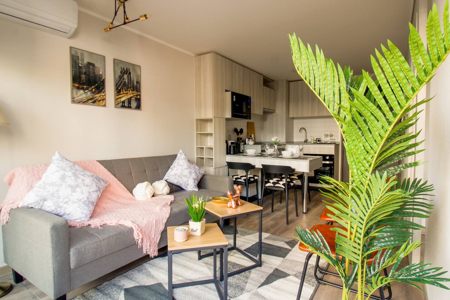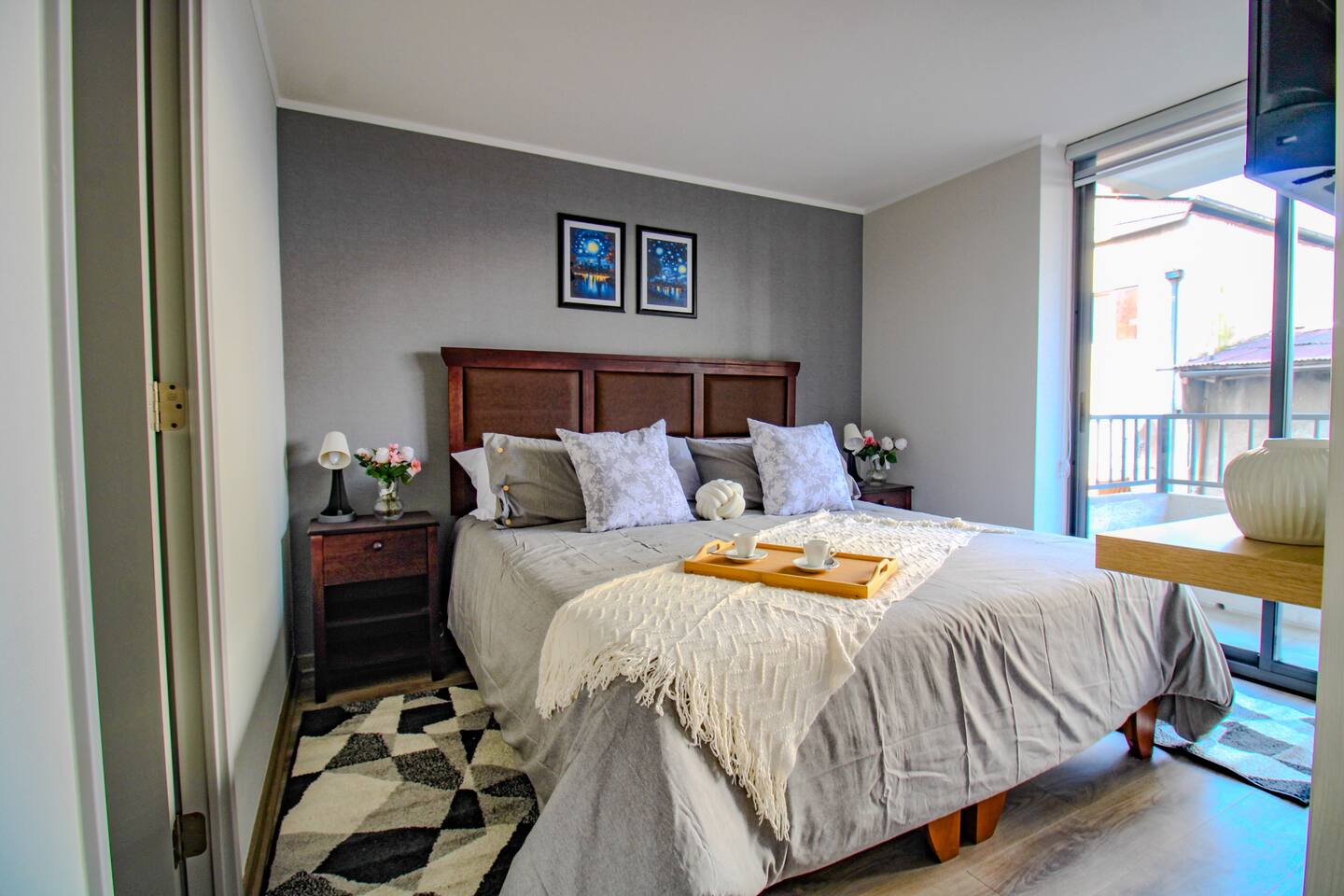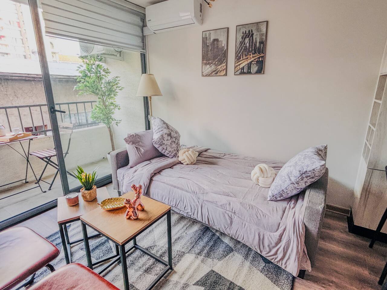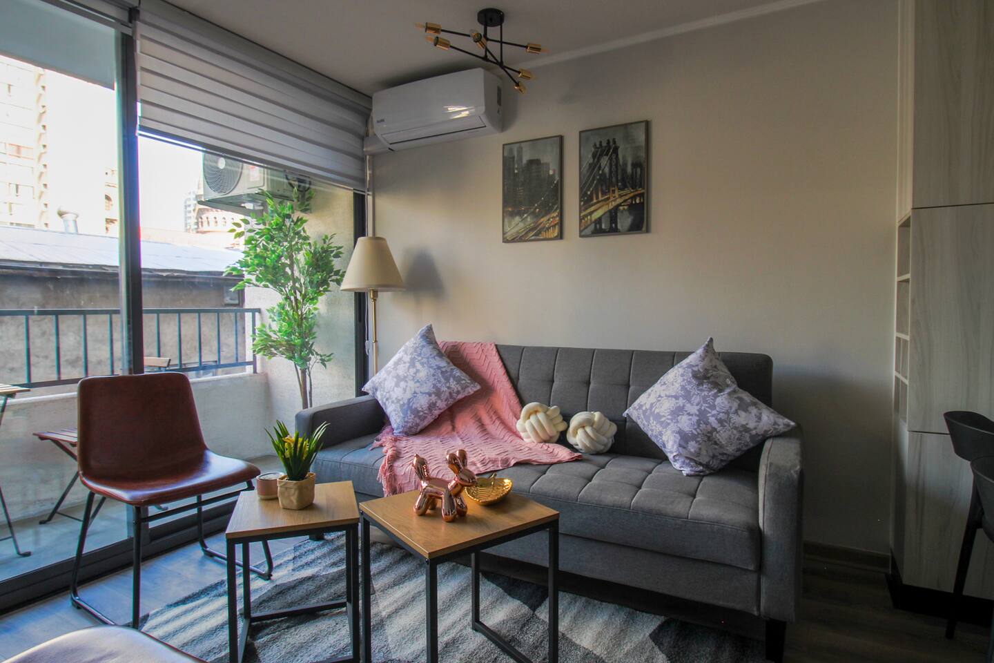 Acogedor departamento en pleno centro de Santiago a pasos del Metro Parque Almagro y de Universidad de Chile. Podrás disfrutar de Santiago a todo al alcance caminando. Cerca de la estaciones de metro Universidad de Chile y Parque de Almagro, lugar dentro de la ruta de tours de las agencias. Ubicado en edificio con seguridad 24/7 y todo a pasos: metro, cafés, parques y cultura. Si necesitas estacionamiento podemos gestionar uno con un costo adicional súper económico.