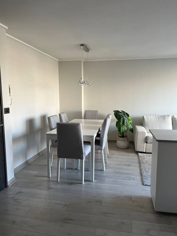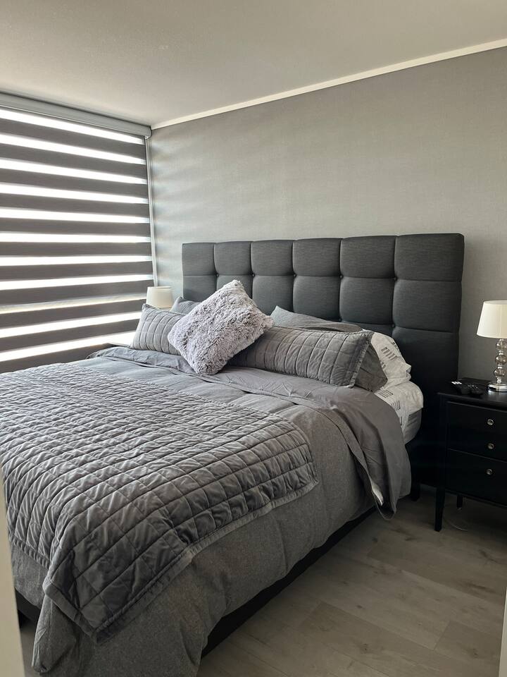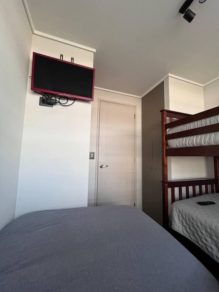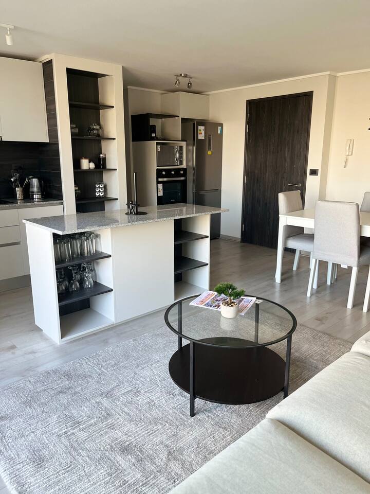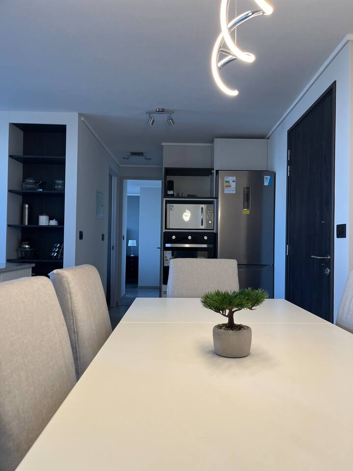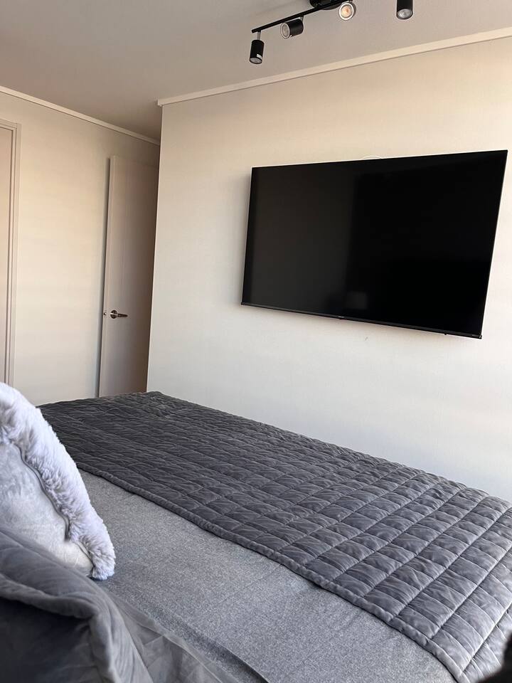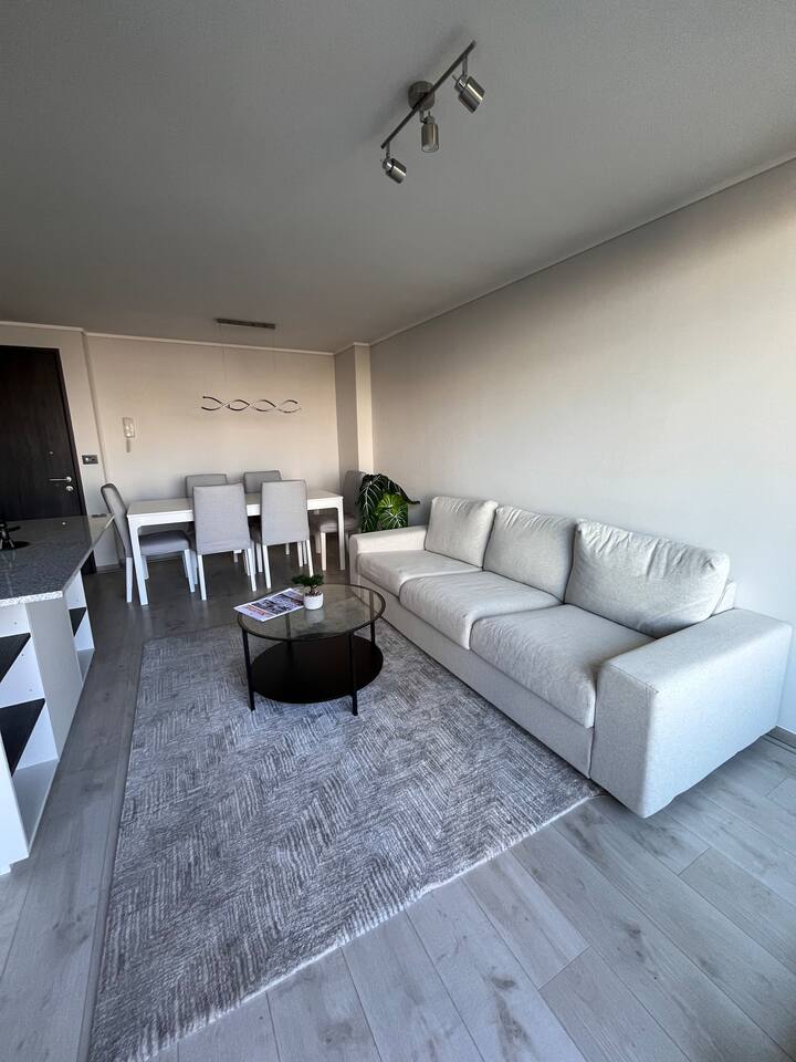 Ven a disfrutar de este moderno y luminoso departamento de 63 m² en La Cisterna, de estilo minimalista con toques nórdicos. Ideal para 5 personas, con cocina completamente equipada, comedor amplio, aire acondicionado y vista a la cordillera 🏔️ desde el balcón con malla de seguridad. Dormitorio principal con cama king y segundo dormitorio con litera más cama. Edificio seguro con conserjería 24/7 y excelente conexión al metro, centro y aeropuerto. ¡Comodidad y diseño en un solo lugar!