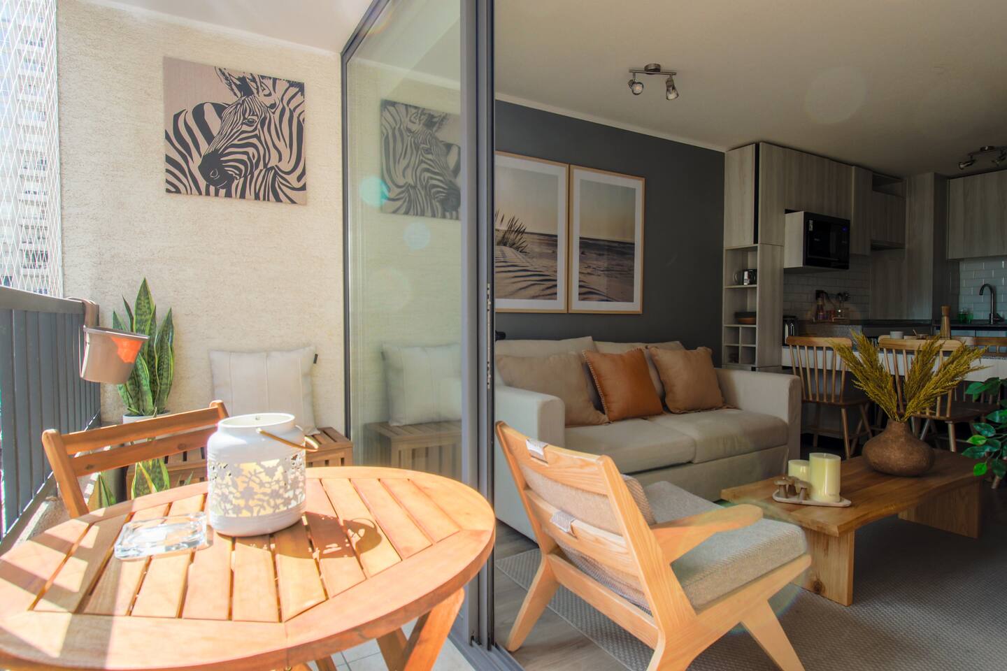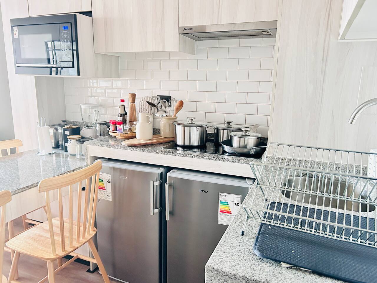 🛋️Lo que ofrece el espacio: 1- Sala de estar luminosa: 1.1 con Sofá Cama doble VIMLE. 1.2 Nuestra poltrona Aoyama para que te sientas cómodo. Decorada con un toque minimalista, nórdico japandi, perfecta para descansar o disfrutar de una buena lectura y contemplar la decoración de madera. 1.3 Calefactor y/o aire acondicionado. Para que tu estadía tenga el calor o frío dependiendo de la estación del año. 2- Cocina 2.1 Completamente equipada para hasta 6 personas y que puedas preparar tus comidas favoritas. Hay café molido para la cafetera francesa y tetera con filtro de infusión para té, para que disfrutes un momento único. 2.2 Especieros y salsa de soya para que prepares tus platos preferidos. 3.3 Ollas, sartenes, cucharones, cuchillo de cocina, licuadora, etc. Todo full equipado. 3.4 Encimera eléctrica de 3 quemadores. 3- Dormitorio en suite: decoración Nórdico Japandi. 3.1 Cama King con base europea de madera de roble (OAK) marca CIC. Incluye sábanas, frazadas y plumón para las 4 estaciones del año. Tiene 4 almohadas de 50x90 cm y dos cojines decorativos. 3.2 Baño privado con ducha tipo hotel. 3.3 Walking closet de 4 metros cuadrados. 3.4 Smart TV conectado al Wifi para tus streaming favoritos: Netflix, HBO Max, Disney+, YouTube, etc. 3.5 Toallas de mano. 3.6 Ventana termopanel. 3.7 Calefactor y/o aire acondicionado. Para que tu estadía tenga el calor o frío dependiendo de la estación del año. 4- Dormitorio 4.1 Litera de madera "Isabela" con colchones ortopédicos que mejoran el descanso. Incluye sábanas, dos almohadas cada una, frazadas adicionales y plumón para las 4 estaciones del año. 4.2 Baño con ducha tipo hotel frente al dormitorio. 4.3 Toallas de baño y mano para cada huésped. 4.4 Ventana termopanel. 4.5 Calefactor y/o aire acondicionado. Para que tu estadía tenga el calor o frío dependiendo de la estación del año. 4.6 Closet. 5- Logia con lavadora de 9 kilos y secadora de 5 kilos. Se incluye de cortesía dispensador de detergente y suavizante. 6- Balcón de 6 metros cuadrados con vista a la torre Entel de Santiago de Chile. Incluye terraza para disfrutar tu café y todo el balcón tiene malla de seguridad. 7- Estacionamiento incluido: Tu auto siempre estará seguro, de 2,5 metros de altura. Solo indícame que ocuparás estacionamiento y te indico detalles. Ya sea que vengas por trabajo o por turismo, este espacio es ideal para disfrutar Santiago con estilo y confort. Queremos que tu estadía sea lo más cómoda y especial posible. Por eso, ponemos a tu disposición una serie de servicios adicionales que puedes solicitar según tus necesidades: 🍷 Tours Personalizados ¿Tours o traslados? Podemos ayudarte a coordinar servicios de transporte o tours que pasen a buscarte directamente al departamento. Contáctanos con anticipación y te compartiremos opciones disponibles. 👨🍳 Chef Privado a Domicilio Convierte tu estadía en una experiencia gourmet. Disfruta de un brunch, almuerzo o cena preparados por un chef en el mismo departamento, con ingredientes frescos y presentación de alto nivel. Ideal para ocasiones especiales o simplemente para darte un gusto. Reserva con anticipación para coordinar menú y horarios. ⸻ 👶 Servicio de Babysitter ¿Te gustaría disfrutar de la ciudad con tranquilidad? Contamos con babysitters confiables y con experiencia, para cuidar a tus hijos mientras tú te relajas. Disponible por hora, medio día o jornada completa. Sujeto a coordinación previa. Consulta tarifas y disponibilidad. ⸻ 💆 Masajes en el Departamento Relájate sin salir. Maribel te ayuda a aliviar tensiones y contracturas con masajes personalizados, acompañados de música suave y ambiente relajante. ⸻ 💅 Manicure y Cuidado de Uñas Ignacia te ofrece un servicio profesional en el departamento: esmaltado permanente, diseño personalizado o tratamientos soft gel, todo adaptado a tu estilo. ⸻ 🚖 Traslado desde y hacia el Aeropuerto ¿Prefieres evitar complicaciones? Coordinamos tu transporte desde o hacia el aeropuerto, para que viajes cómodo y a tiempo. 🧳 Guardado de Equipaje ¿Tu vuelo llega antes del check-in o sale después del check-out? Guardamos tus maletas en nuestras bodegas seguras para que disfrutes sin cargas. ⸻ 🧼 Limpieza Durante la Estadía ¿Necesitas aseo adicional durante tu visita? Podemos programarlo cuando lo indiques, según tu comodidad.