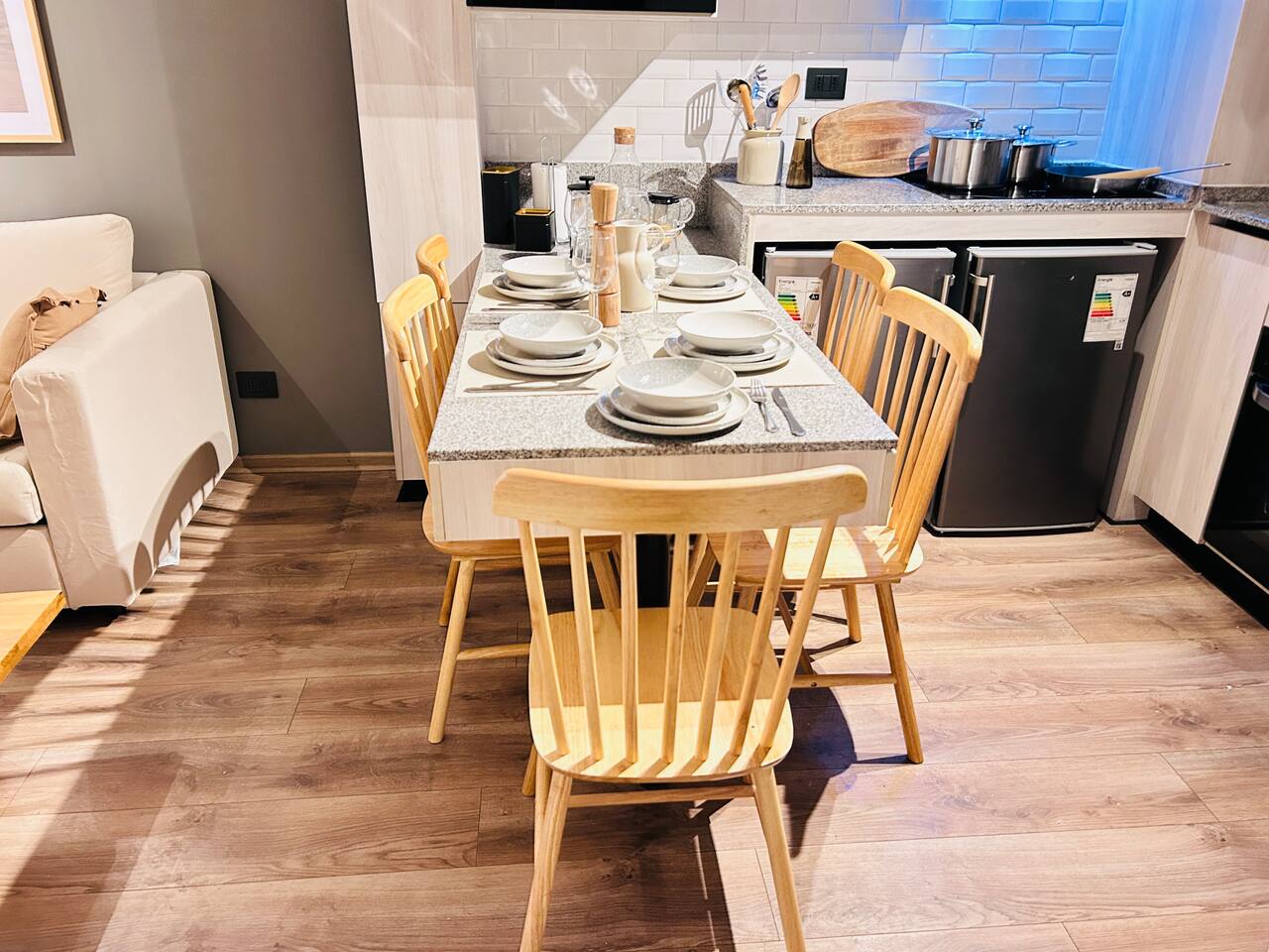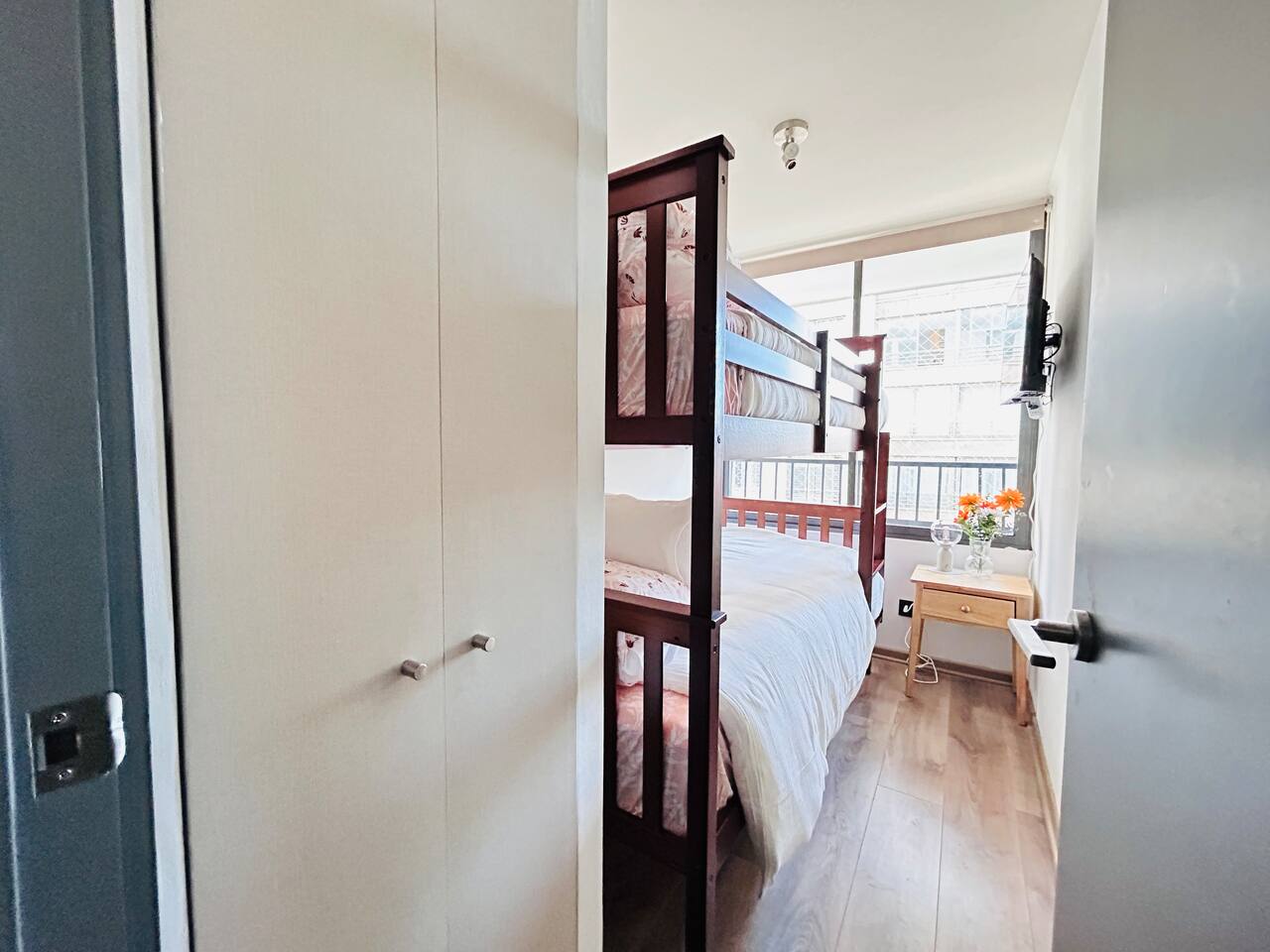Design y confort en pleno Santiago Centro — sector Santa Lucía / San Isidro. Ubicado a 5 minutos del metro Santa Lucía, en un barrio con excelente conectividad, supermercados, restaurantes, farmacias y cafeterías a solo pasos. El edificio cuenta con conserjería 24/7, acceso controlado y buena iluminación peatonal. Cama king, litera con colchones premium y sofá cama en un espacio moderno y acogedor, pensado para que descanses, trabajes o explores la ciudad sintiéndote como en casa.