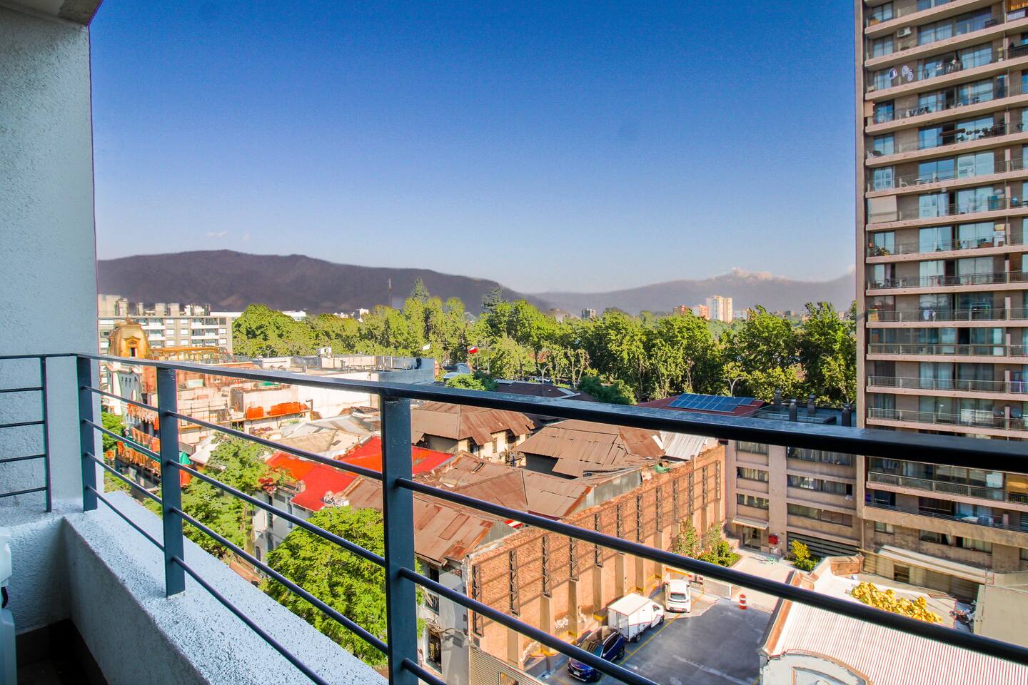 📍 Ubicación estratégica: ¡será muy fácil planear tu visita!. Características principales: 🏠 Cocina Full equipado 📍 Vista cordillera. Cerca Club Hípico y Movistar arena 🚇Metro Unión Latinoamericana, República y Toesca 🔑 Auto check-in 🛜 Wifi Fibra 800 mpbs 🌬️ Aire acondicionado y calefacción 🛏️ Cama dos plazas 🧴 Toallas y ropa de cama incluidas 💪 Gimnasio 🏊 Piscina no temperada 📺 Smart TV 🚗 Estacionamiento subterráneo de pago, sujeto a disponibilidad: CL6.000 pesos la noche